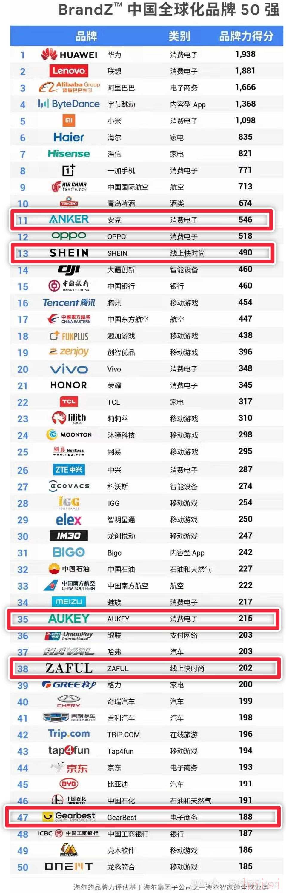 谷歌與凱度聯(lián)合發(fā)布的“2020年BrandZ?中國全球化品牌50強(qiáng)”榜單顯示,有數(shù)家中國跨境電商品牌上榜,其中包括Anker(安克創(chuàng)新)、AUKEY(傲基)、ZAFUL、Gearbest、SheIn。