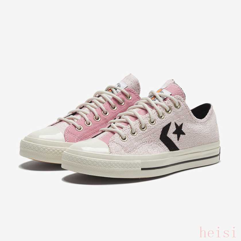 Reverse Terry Star Player共有粉色和白色兩款配色,鞋面由毛圈布和針織布拼接而成,鞋側(cè)的匡威星箭標(biāo)識(shí)使用植絨材質(zhì)印刷,鞋舌采用了不對稱設(shè)計(jì)。