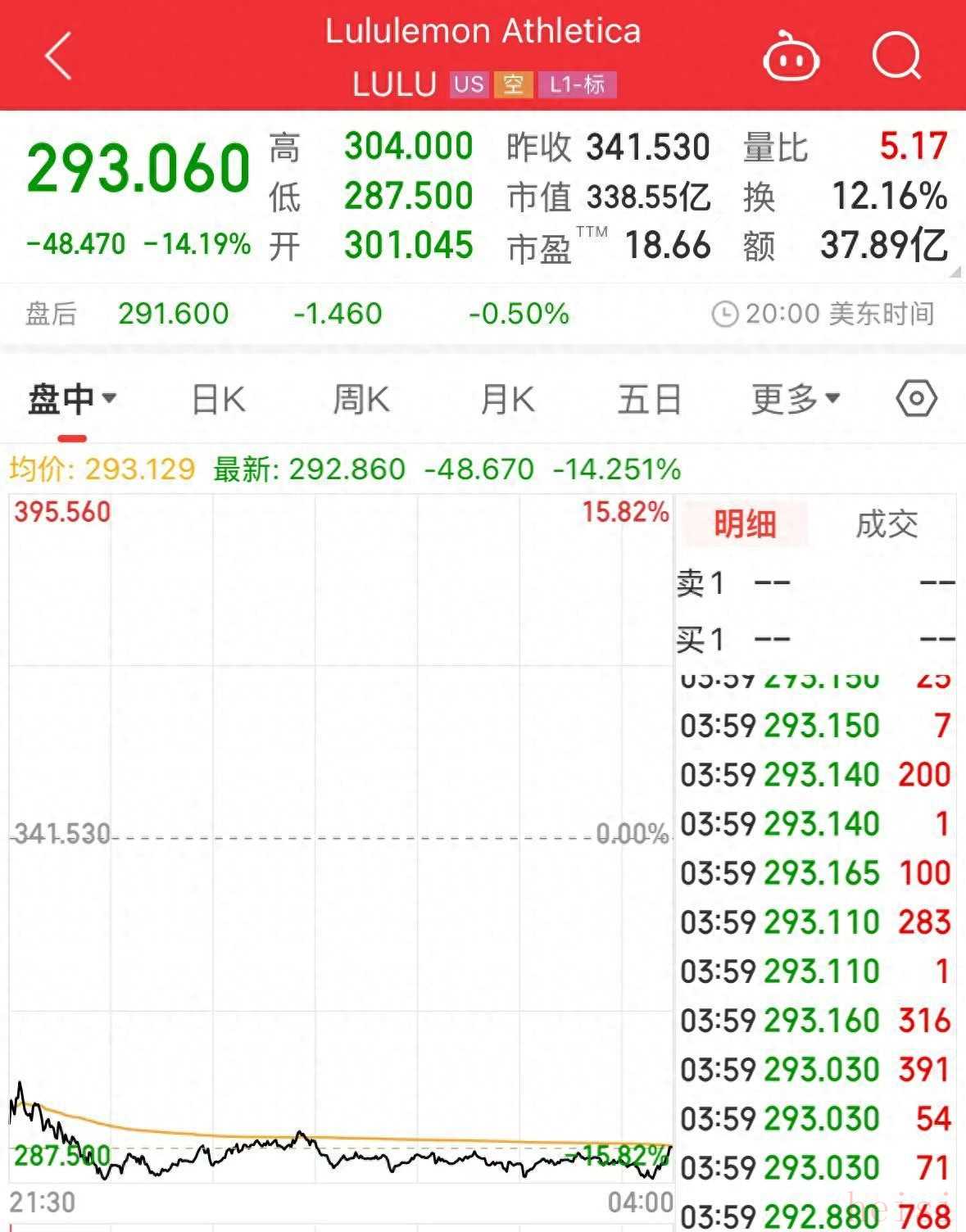 當(dāng)?shù)貢r(shí)間周五(3月28日),加拿大運(yùn)動(dòng)瑜伽服品牌lululemon(露露樂蒙)股價(jià)大跌14.19%,創(chuàng)下2024年3月22日以來最大單日跌幅,市值一天蒸發(fā)56億美元(約合人民幣408億元)。年初至今,其股價(jià)已累計(jì)跌超23%。