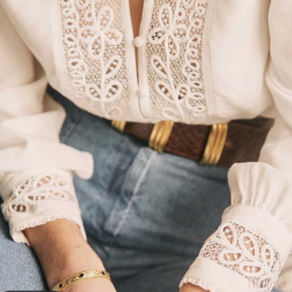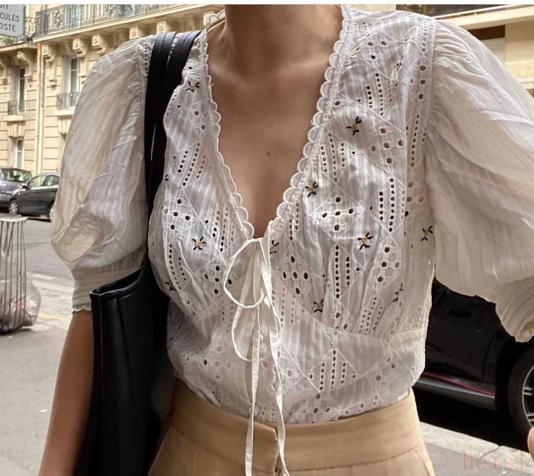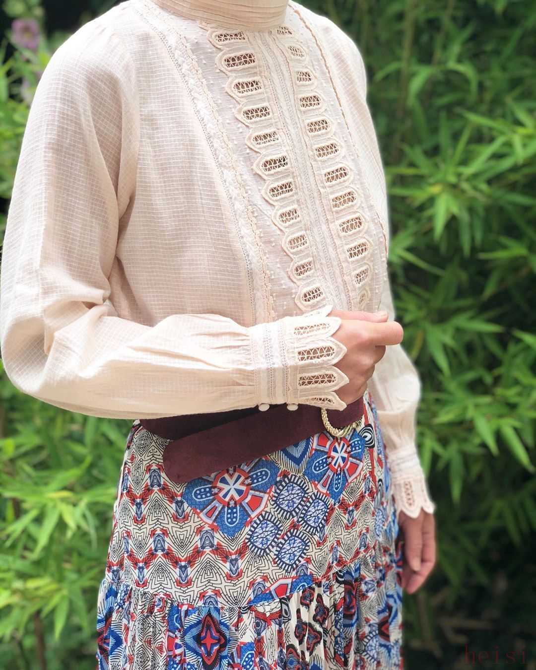 這款有點(diǎn)白色繡花點(diǎn)綴的襯衫,一看就女人味十足,但也不會過分的甜美,胸口的紐扣是可以開合的,覺得有點(diǎn)透的,可以在里面加一件小背心。