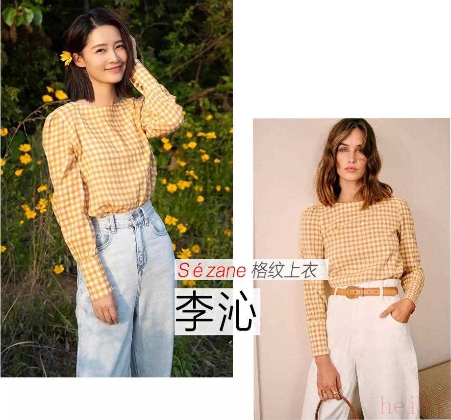 國內(nèi)也有不少女明星在悄悄穿著Sézane的衣服,比如小花李沁,就穿著這件鵝黃色的格紋上衣,在花叢里面完全就是人比花嬌。