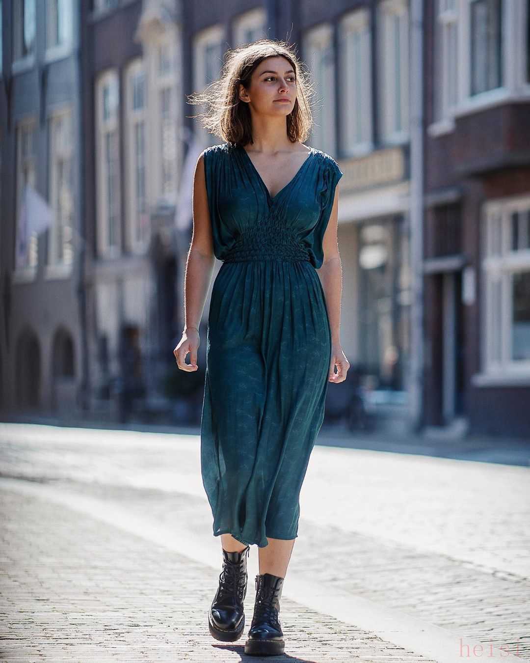 這款墨綠色中長連衣裙,雖然是純色,但是顏色帶來的復(fù)古感撲面而來,腰間和肩膀的褶皺的小設(shè)計(jì)讓腰線和胸部更加突出,貼身垂墜的綢緞面料,既有女人的浪漫,又有夏天的溫柔。