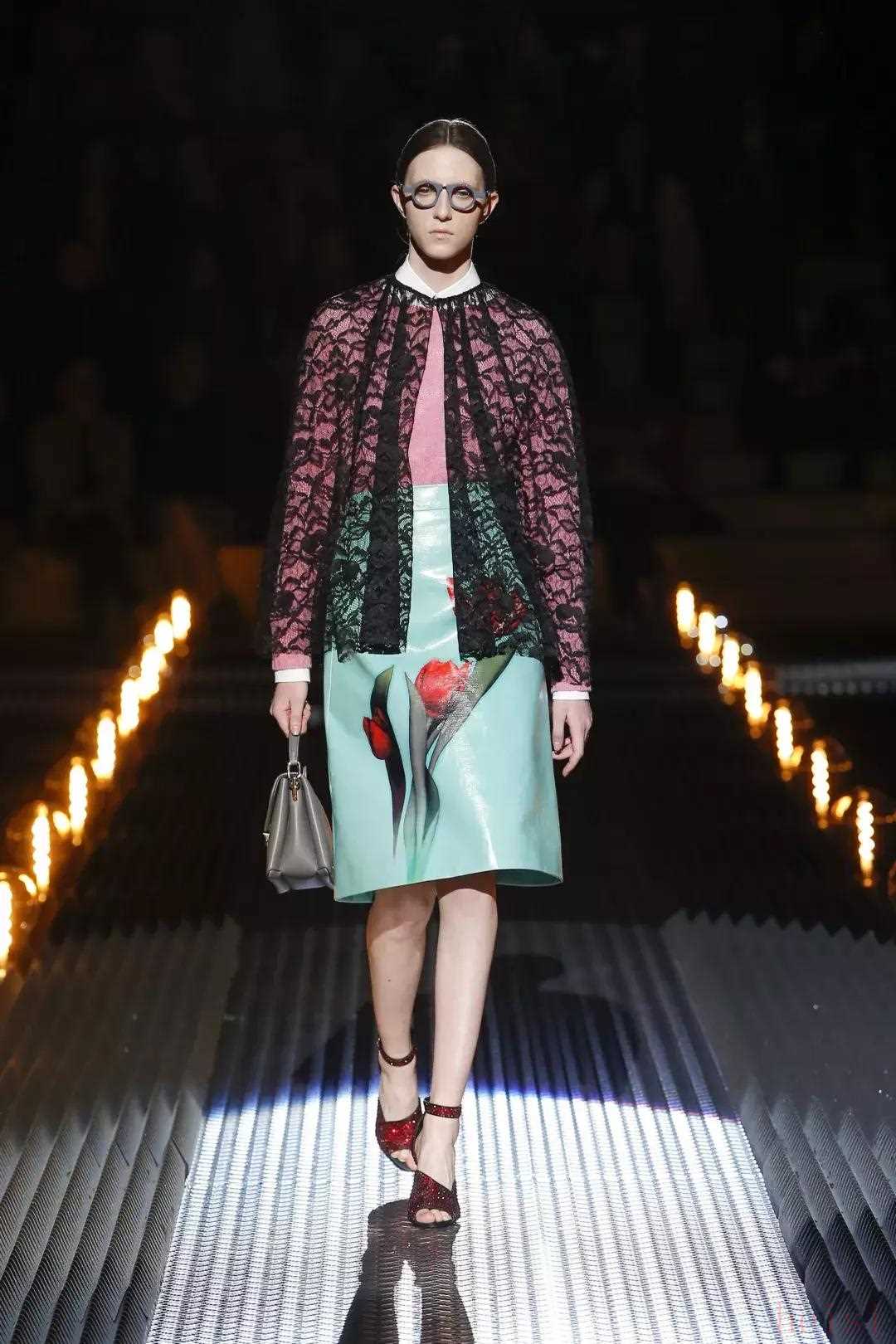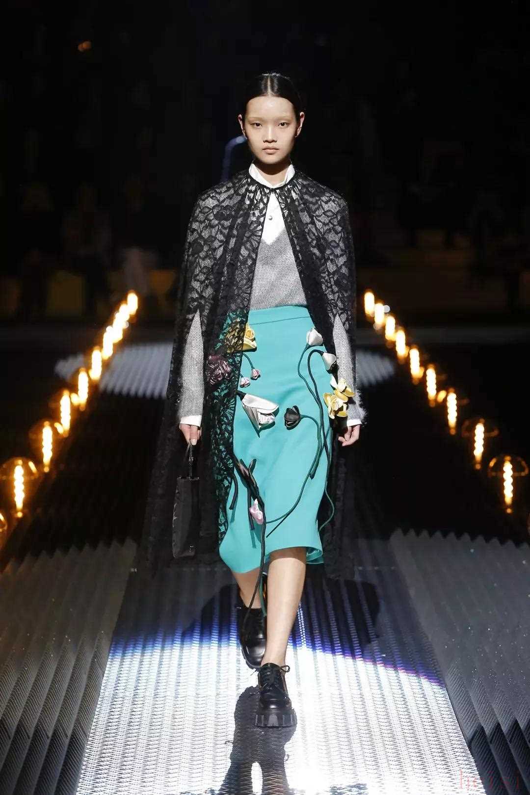 這一季Prada在衣服上多了很多奇妙的裝飾,有呼之欲出的花朵,有童話般的斗篷和閃閃發(fā)光的舞鞋,還有輕盈的蕾絲加持。