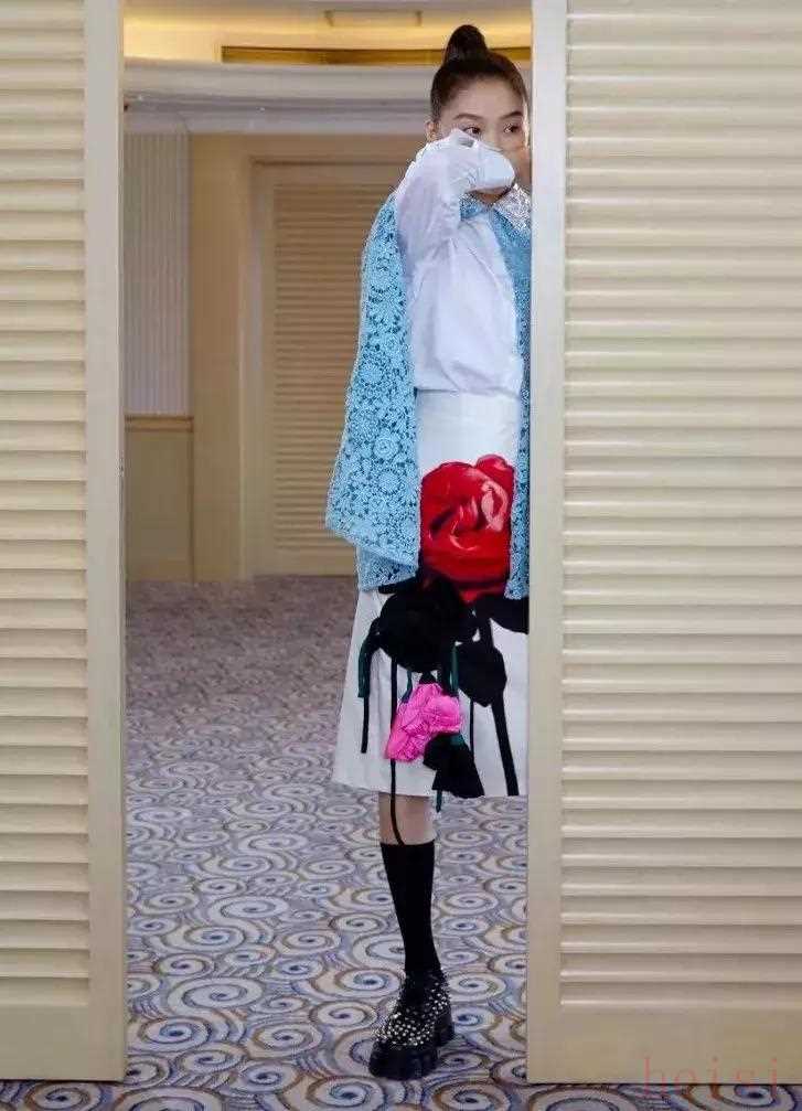 21歲的關曉彤是這樣演繹玫瑰元素的:學生襪和厚底鞋,身上選擇baby blue的蕾絲披肩,多了幾分青澀和可愛。