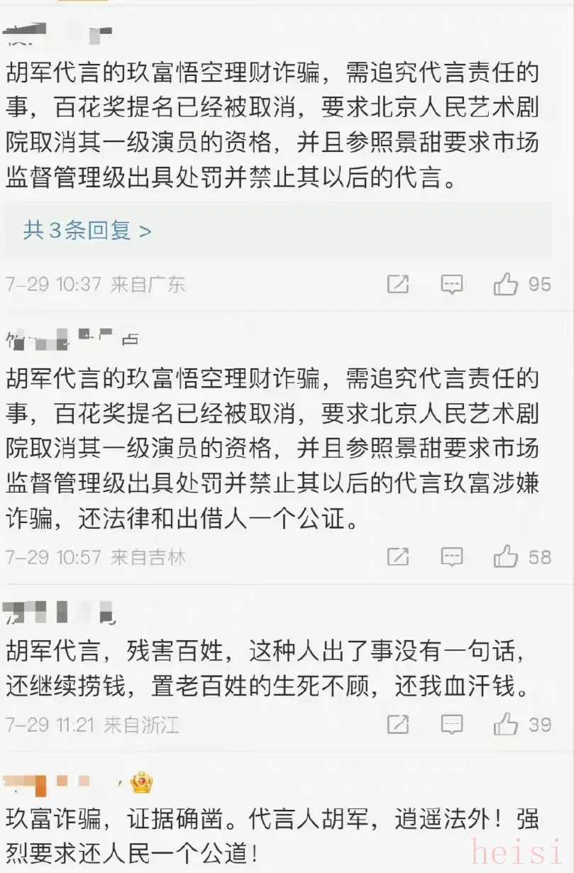 因為代言的理財產品疑似詐騙,涉及34萬受害者,共計390億元,如此高的金額,就算是對胡軍這樣的一線藝人來說,也是一記重創(chuàng),更別說是普通百姓了。不少受害者都群起而攻之,把矛頭指向胡軍,甚至不少網友都跑到了胡軍的社交賬號下面“討公道”,讓胡軍給他們一個說法。