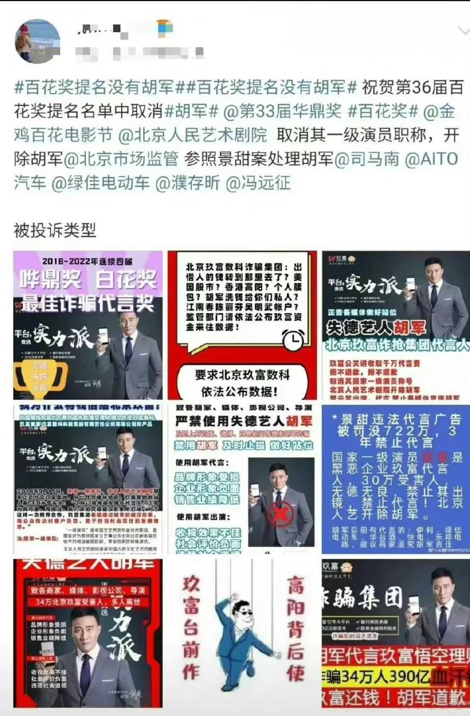 3. "百花獎取消其提名":在“正心谷資產”事件發(fā)酵后,中國電影家協會主辦的第九屆中國電影百合獎在其官方微博上宣布,取消胡軍因主演電影《天龍八部》而提名的“最佳男主角”獎。官方聲明中提到了“近期事件”,這通常指的就是他代言的理財產品出事,給他的公眾形象帶來了負面影響,不符合獎項的榮譽要求。