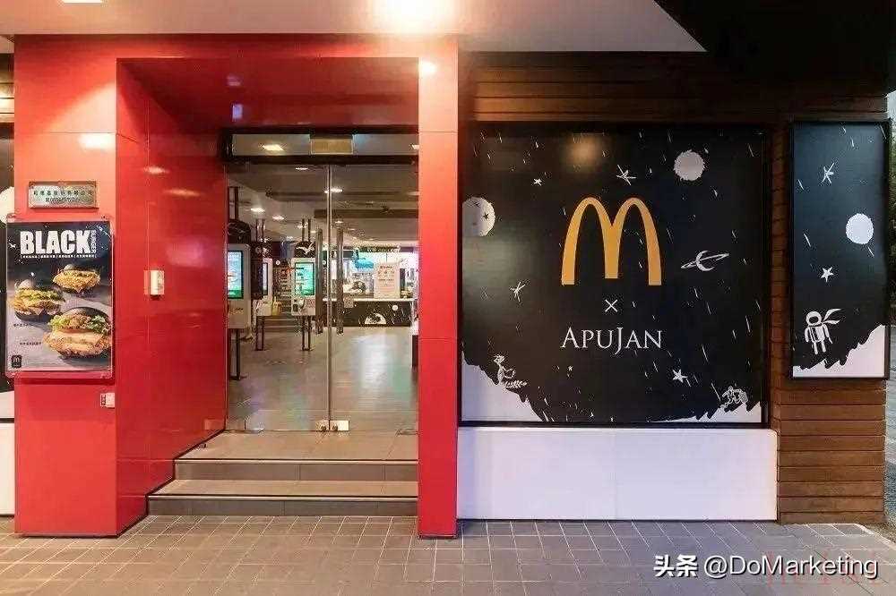 2021年,雙方推出了全球唯一限定極黑包裝設(shè)計(jì),而且還打造一家麥當(dāng)勞“All in Black 極黑主題店”。APUJAN 以品牌時(shí)裝常見的云朵、月亮、星星、恐龍骨骸、太空船穿插融入漢堡、薯?xiàng)l的黑色系包裝中,以飛船、月球、人造衛(wèi)星、星球、翼龍等元素進(jìn)行餐廳設(shè)計(jì),將其打造成兼具時(shí)尚與未來感的黑色太空站。
