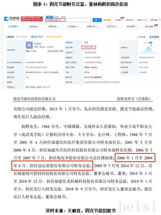 招股書(shū)顯示,2008年1月至2009年6月,固克節(jié)能財(cái)務(wù)總監(jiān)、董秘楊輝擔(dān)任冠達(dá)星股份有限公司財(cái)務(wù)總監(jiān),而據(jù)公開(kāi)資料顯示,冠達(dá)星股份有限公司成立于2011年9月,如圖表4所示。那么,楊輝是如何在3年后才成立的公司任職?其為何要捏造工作經(jīng)歷,其財(cái)務(wù)總監(jiān)的任職資格是否合理?