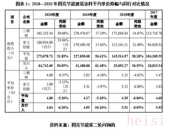 值得注意的是,2018年至2020年,固克節(jié)能建筑涂料的銷(xiāo)售單價(jià)的降價(jià)幅度均高于行業(yè)均值。