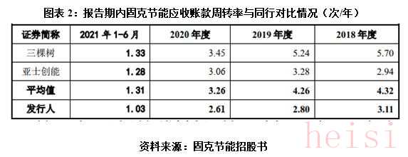 除對(duì)外銷(xiāo)售面臨不利影響外,報(bào)告期內(nèi),固克節(jié)能的財(cái)務(wù)情況也出現(xiàn)惡化。報(bào)告期末,該公司應(yīng)收賬款賬面余額分別為2.09億元、3.16億元、4.16億元和4.92億元,呈逐年增長(zhǎng)趨勢(shì);應(yīng)收賬款周轉(zhuǎn)率分別為3.11次/年、2.8次/年、2.61次/年和1.03次/年,呈逐年下降趨勢(shì),而同期可比公司應(yīng)收賬款周轉(zhuǎn)率均值分別為3.11次/年、2.8次/年、2.61次/年和1.31次/年,均高于固克節(jié)能,如圖表2所示。
