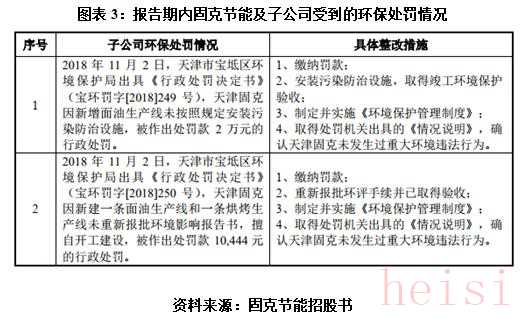 自身管理方面,報(bào)告期內(nèi),固克節(jié)能子公司天津固克受到2次行政處罰。具體來(lái)看,如圖表3所示,2018年11月2日,因新增面油生產(chǎn)線(xiàn)未按照規(guī)定安裝污染防治設(shè)施,天津固克被罰款2萬(wàn)元;同日,因新建一條面油生產(chǎn)線(xiàn)和一條烘烤生產(chǎn)線(xiàn)未重新報(bào)批環(huán)境影響報(bào)告書(shū),擅自開(kāi)工建設(shè),天津固克被罰1.04萬(wàn)元。