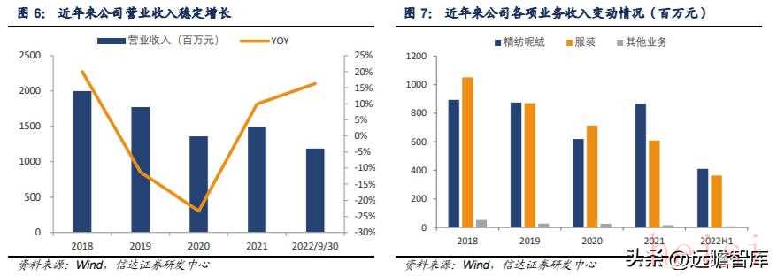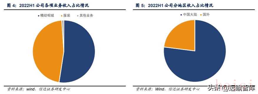 分產(chǎn)品看,公司主要收入來源為精紡呢絨和服裝,2022H1 兩者收入比重分別為 52.47%和 46.46%,其他業(yè)務主要由邊角料銷售貢獻。
