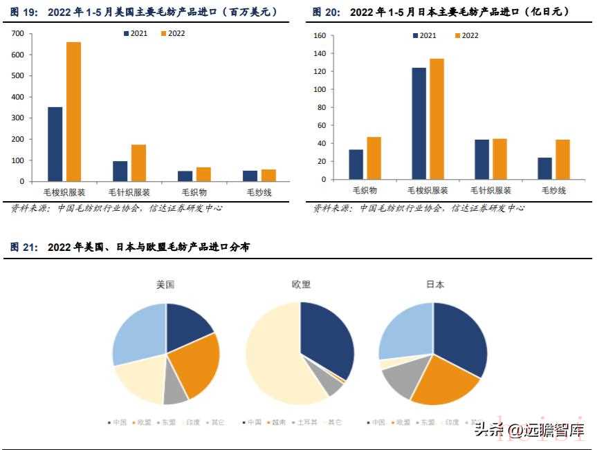 日本方面,在低基數(shù)影響下,2022 年 1-5 月日本毛紡產(chǎn)品進口額呈現(xiàn)較快增長,毛織物、毛紗線產(chǎn)品同比增長 43.56%、87.15%。