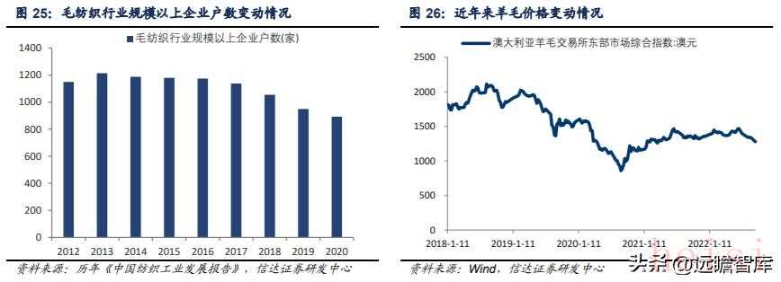 這類企業(yè)通常缺乏研發(fā)、設計能力,生產(chǎn)技術及工藝落后,規(guī)模小、產(chǎn)品質(zhì)量低,定價能力弱,低端產(chǎn)能過剩,難以進入高端產(chǎn)品領域參與競爭,滿足消費升級需求,因此近年來在人力成本上漲、原材料成本波動的背景下,大量中小企業(yè)因技術儲備不足、人才和資金短缺,難以實現(xiàn)生產(chǎn)設備的升級與技術改革,在激烈的市場競爭中退出市場,2020 年國內(nèi)毛紡行業(yè)規(guī)模以上企業(yè)數(shù)僅為 893 家,同降 6%。