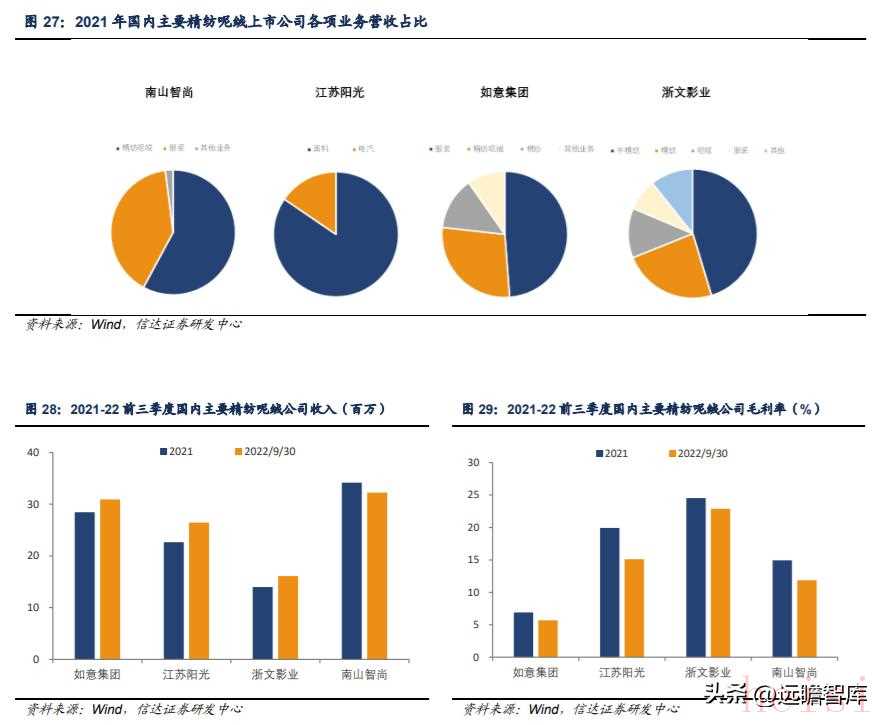 相較于面料、成衣環(huán)節(jié)占比較高的公司,新澳股份、浙文影業(yè)以紗線業(yè)務為主,標準化程度較強、規(guī)模天花板較高,盈利能力相對較低,22 年前三季度毛利率為 19.23%、16.09%。