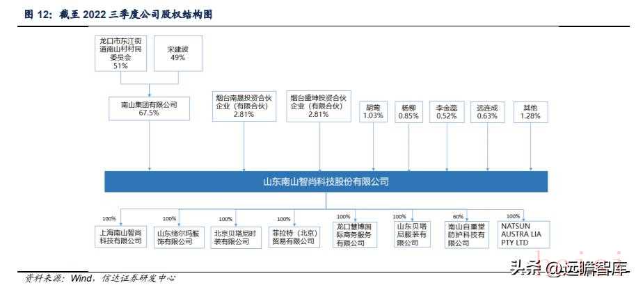 通過“公司制農(nóng)村發(fā)展模式”,南山村得以迅速發(fā)展,目前南山集團旗下上市公司包括南山智尚、南山鋁業(yè)、恒通股份。南山集團直接持有南山智尚 67.5%的股份,并通過員工持股平臺煙臺南晟和高管持股平臺煙臺盛坤各間接持有 2.81%的股份。