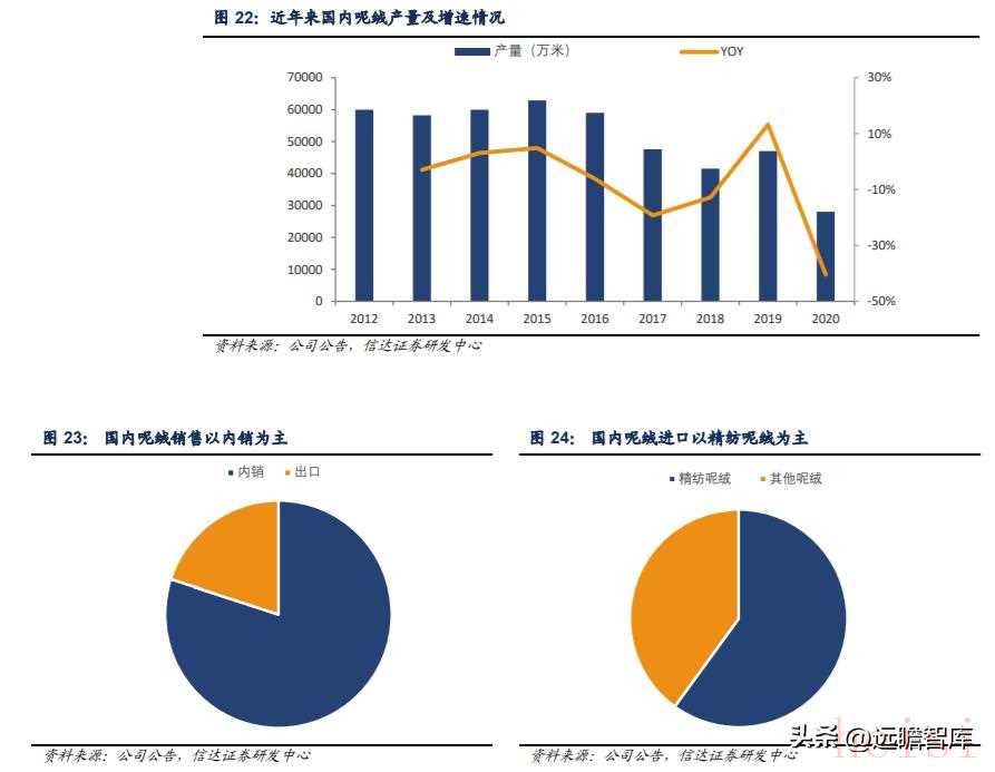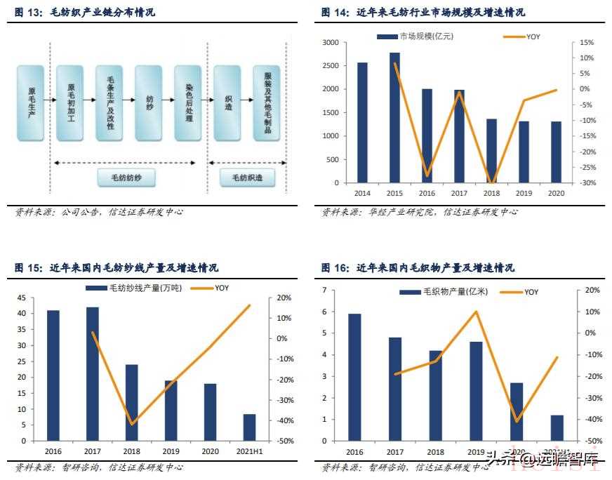 從產(chǎn)量來看,疫情后國內(nèi)毛紡消費市場持續(xù)鞏固復蘇趨勢,2021H1 國內(nèi)毛紗線、毛織物產(chǎn)量分別為 8.4 萬噸、1.2 億米,同增 16.2%、-11.1%。