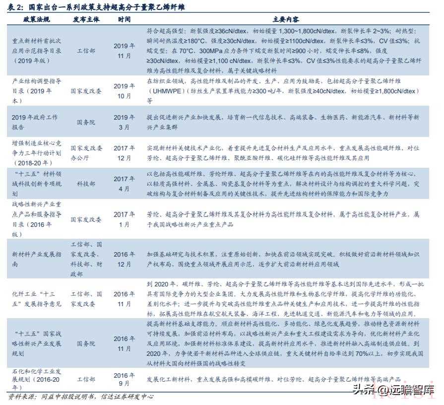 為實現(xiàn)國內(nèi)高端纖維的進口替代,促進本土產(chǎn)業(yè)發(fā)展,國家出臺一系列 UHMWPE 鼓勵政 策,如 2016 年 11 月《化纖工業(yè)“十三五”發(fā)展指導意見》提出“到 2020 年超高分子量聚乙烯纖維基本達到國際先進水平,形成一批具有國際競爭力的大型企業(yè)集團的發(fā)展目標”。