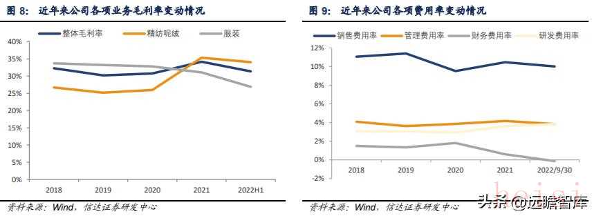 分業(yè)務看,精紡呢絨產(chǎn)品毛利率整體呈上行趨勢,21 年精紡呢絨毛利率同增 9.36PCT 至 35.35%,主要系公司注重面料新功能研發(fā),且注重通過工藝改進、擴大產(chǎn)品在服用性能方面優(yōu)勢,提高附加值產(chǎn)品占比。