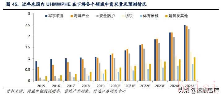 近年來國內(nèi)超高分子量聚乙烯纖維的斷裂程度等關鍵指標不斷提升,同時產(chǎn)能規(guī)模快速擴 張,需求量方面,日益增加的軍品、民品應用將為 UHMWPE 帶來龐大市場需求,據(jù)前瞻研究院預計,到 2025 年國內(nèi) UHMWPE 需求量將達到 10.37 萬噸,2021-25 年年均復合增速為 16.24%。