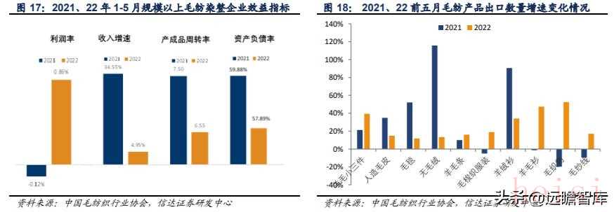 從規(guī)模以上毛紡織染整企業(yè)的效益指標來看,2022 年 1-5 月毛紡行業(yè)累計收入水平保持增 長,但漲幅較去年同期明顯收窄,主要受國內(nèi)新冠疫情擴散影響;產(chǎn)品銷售周期延長,產(chǎn)成品周轉率為 6.55 次/年,較去年同期下降 12%。