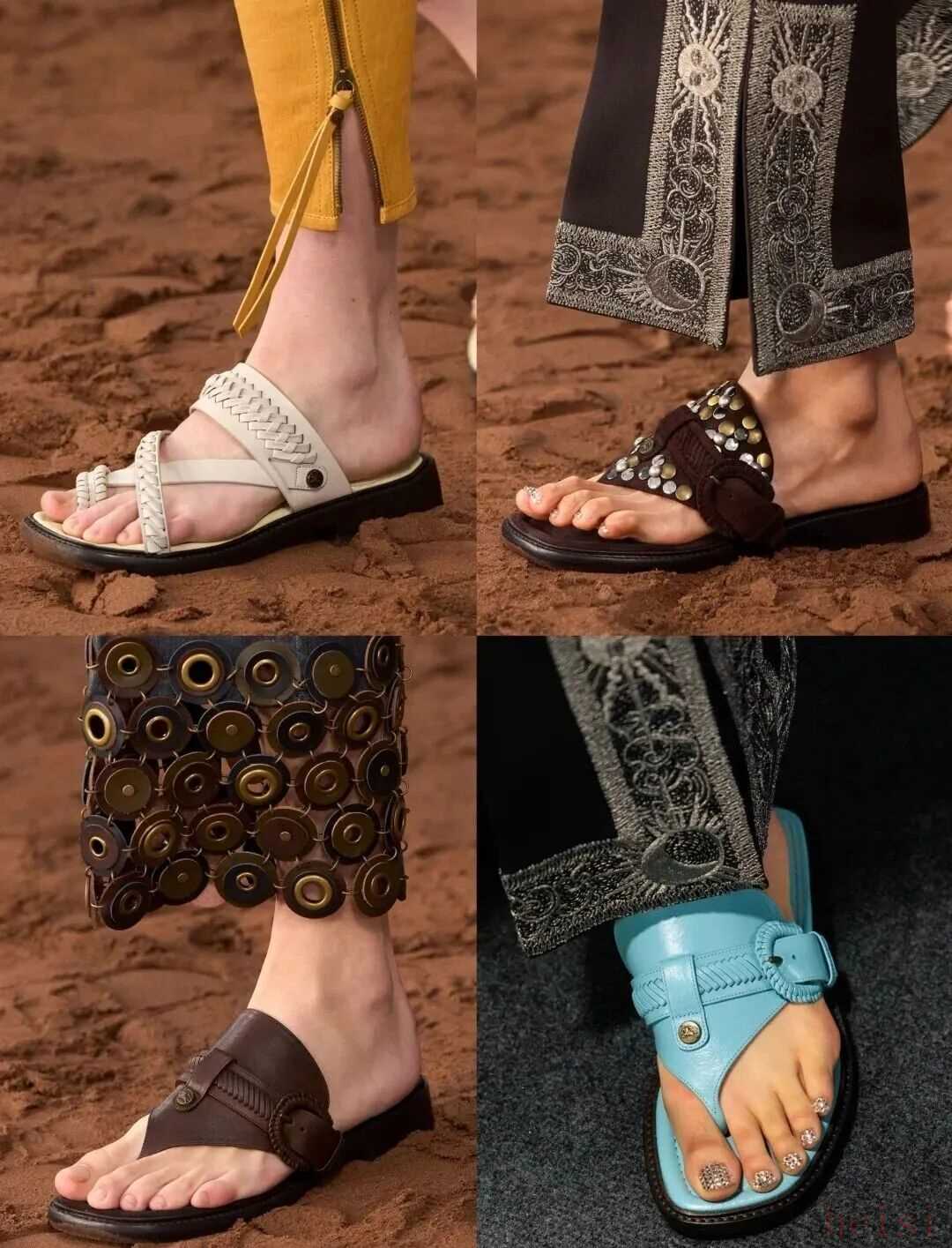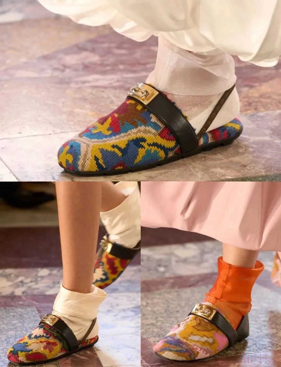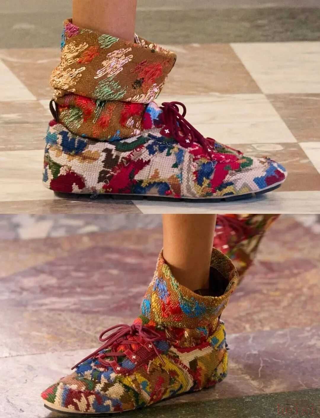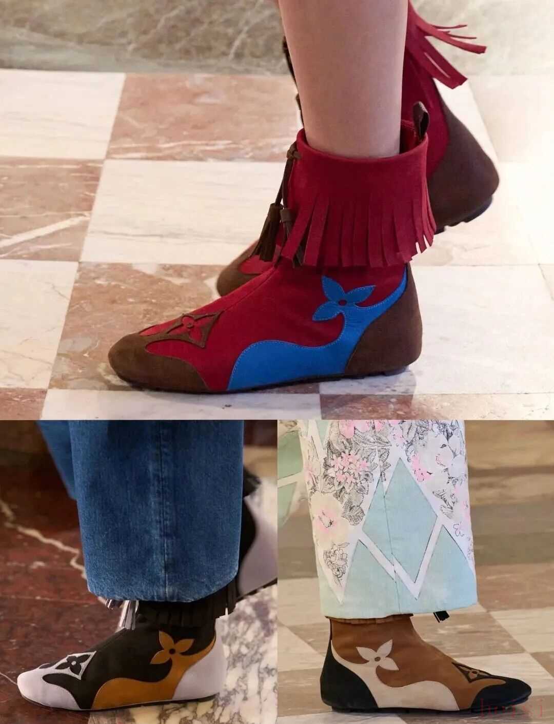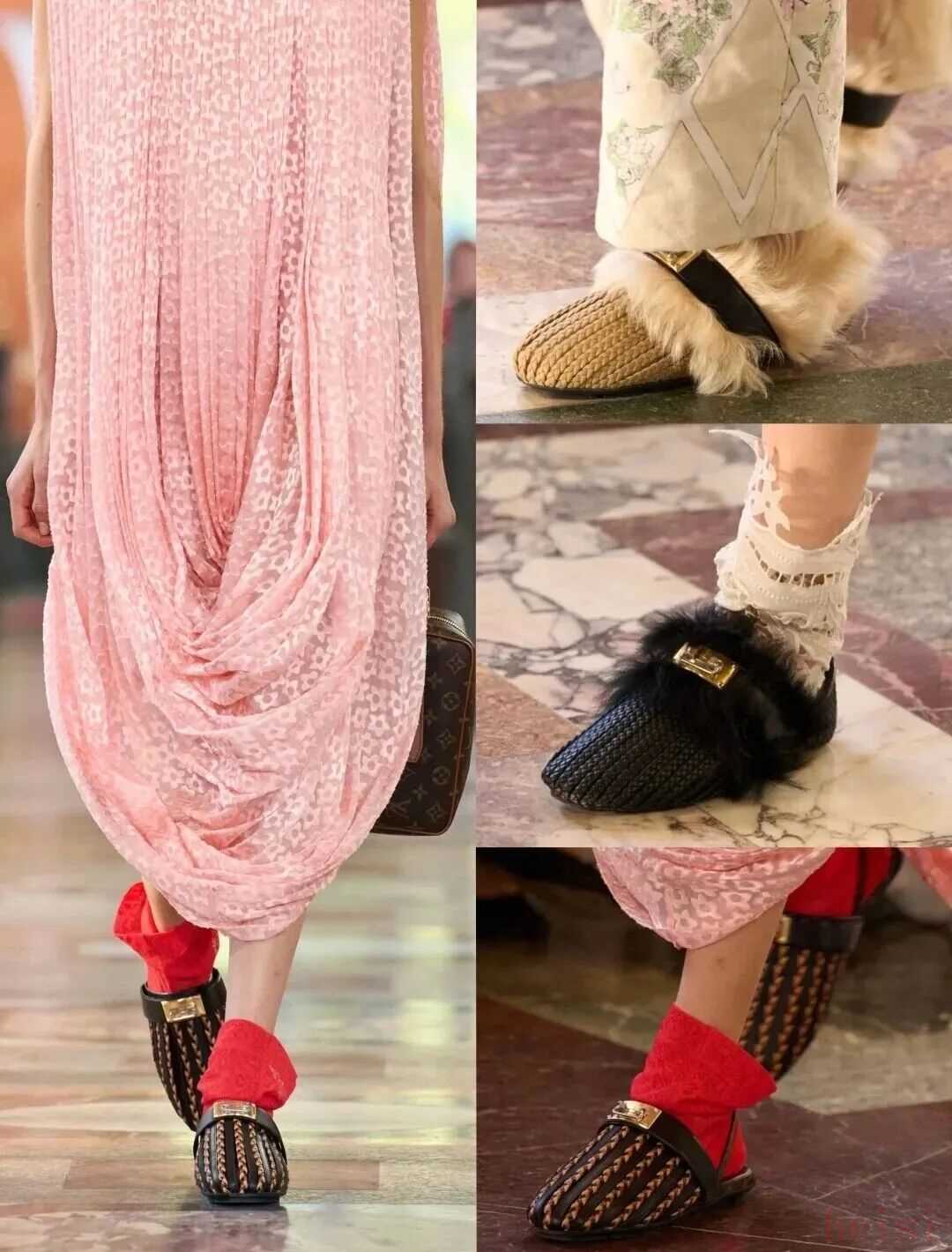 隨著四大國際時裝周(紐約、倫敦、米蘭、巴黎)的正式收官,2026春夏時尚流行走向已逐漸揭曉。2026春夏時裝周,多個品牌新官(創(chuàng)意總監(jiān))上任,比如,Pierpaolo Piccioli帶著Valentino的浪漫主義入主Balenciaga;Simone Bellotti帶著Gucci 16年的男裝功底入主Jil Sander;Louise Trotter帶著“極簡剪裁美學(xué)”從Carven接棒BV;擅長用細(xì)膩的工藝和獨(dú)特的材質(zhì)講故事的Matthieu Blazy則從BV來到了Chanel。新官們?yōu)闀r髦精們上演了一出出“時尚大戲”,同時帶來了許多引人注目的新季鞋履。以Louis Vuitton2026春夏系列鞋款為例,設(shè)計上極具巧思,多元風(fēng)格與文化融合。黑白格紋與皮革拼接,融入品牌標(biāo)識元素,兼具復(fù)古與現(xiàn)代感,是時尚與實(shí)穿的結(jié)合。多彩織毯紋理,搭配金屬扣飾,充滿異域風(fēng)情,仿佛將藝術(shù)織物穿在腳上。紅色流蘇短靴,飾有品牌標(biāo)志性圖案與動物元素,流蘇設(shè)計增添靈動,色彩碰撞吸睛。編織涼鞋結(jié)合皮革與針織材質(zhì),獨(dú)特的編織結(jié)構(gòu)極具設(shè)計感,盡顯品牌在材質(zhì)運(yùn)用上的創(chuàng)新,每一款都細(xì)節(jié)滿滿。為了更全面地呈現(xiàn)2026春夏鞋履趨勢,小世搜集整理了40個品牌的秀場鞋履供大家一覽,建議收藏分析。由于篇幅原因,本期分享以下20大品牌鞋款(按品牌首字母順序),分別是:Acne studios、Anna sui、Balenciaga、Balmain、Burberry、Bottega Veneta、Chanel、Chloé、Dior、Dries van noten、Erdem、Etro、Fendi、Ferragamo、Givenchy、Hermès、Hodakova、Jil Sander、Loewe、Louis vuitton。
