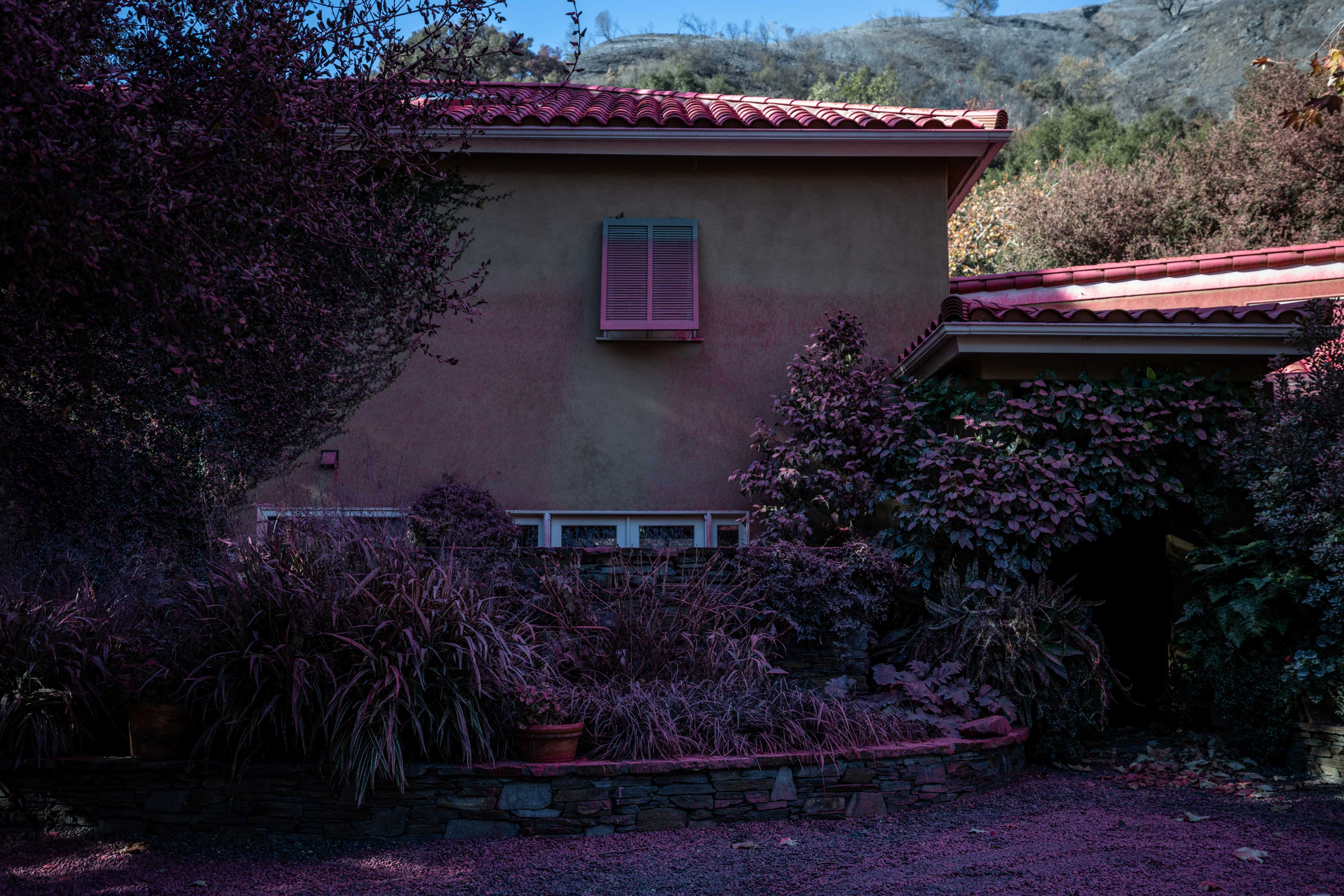 這是1月13日在美國加利福尼亞州洛杉磯曼德維爾峽谷拍攝的一棟噴灑了阻燃劑的房屋。新華社/路透