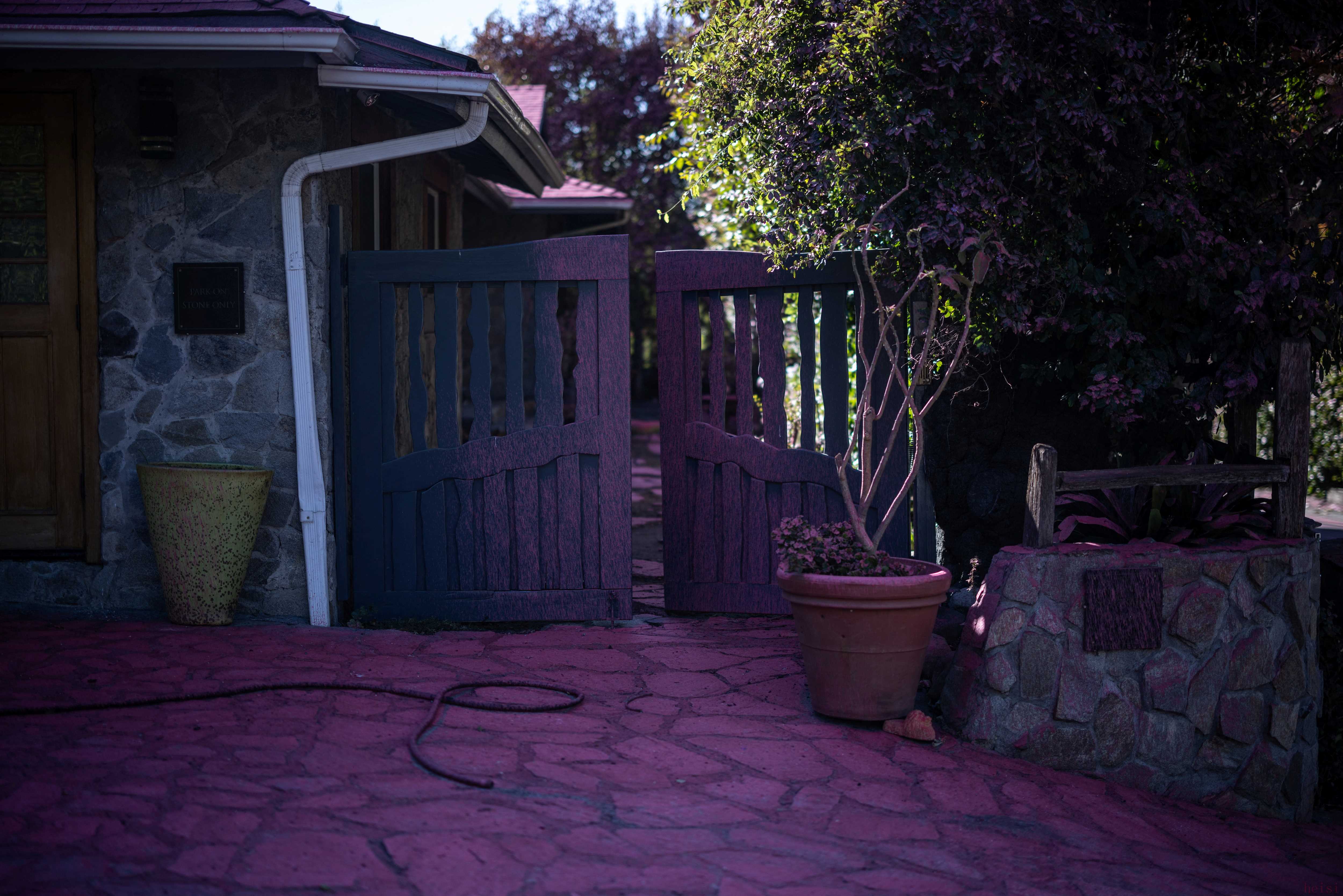 這是1月13日在美國加利福尼亞州洛杉磯曼德維爾峽谷拍攝的噴灑了阻燃劑的住宅后院。新華社/美聯(lián)