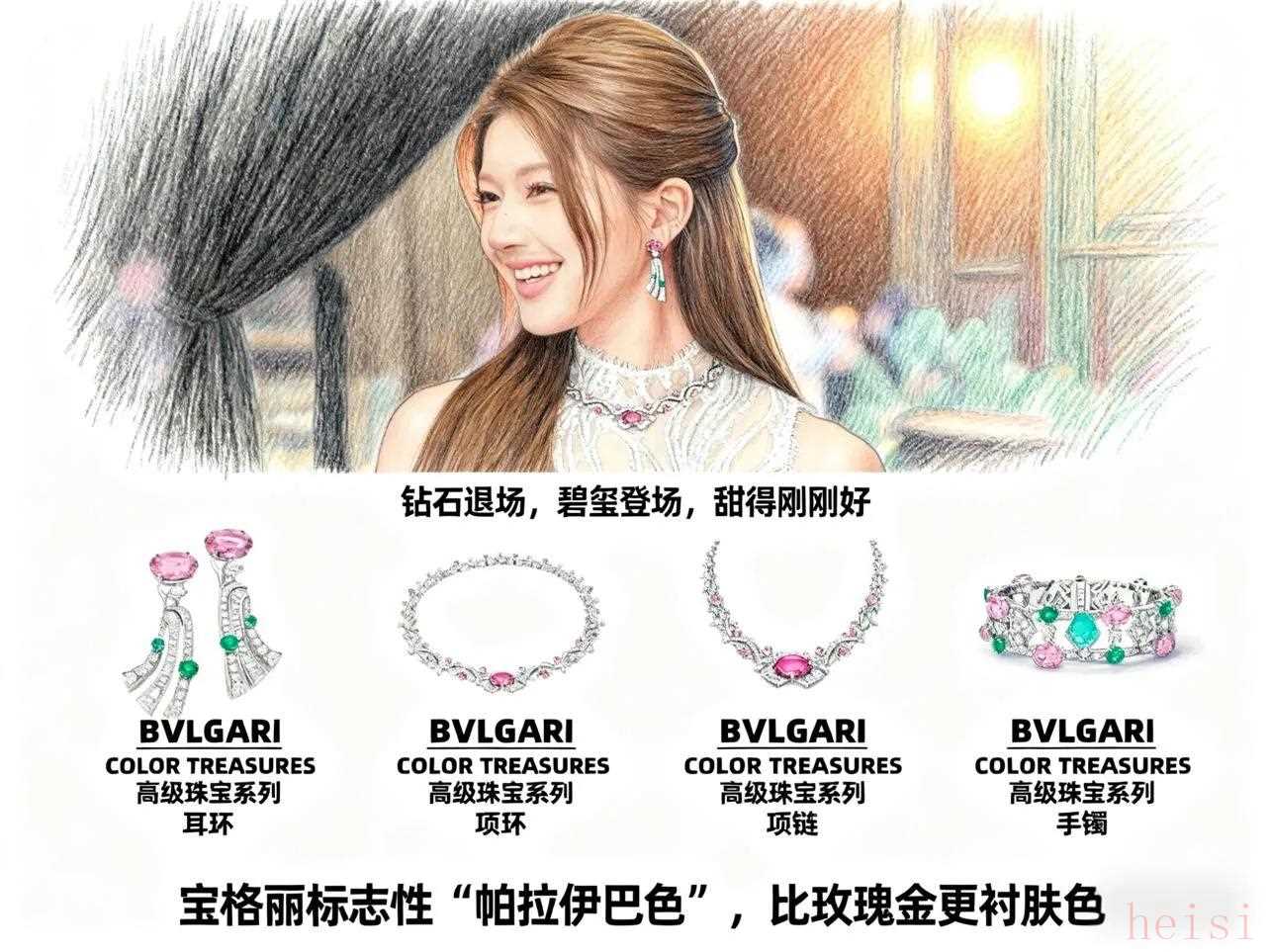 儀式結(jié)束后換敬酒服,許妍果斷摘下鉆石,換上寶格麗碧璽套裝——粉色碧璽像熟透的桃子,套鏈?zhǔn)菨u變的粉,手鏈疊了三條,耳飾是小巧的水滴形,和香檳色禮服配在一起,甜得像杯加了蜜的氣泡水。