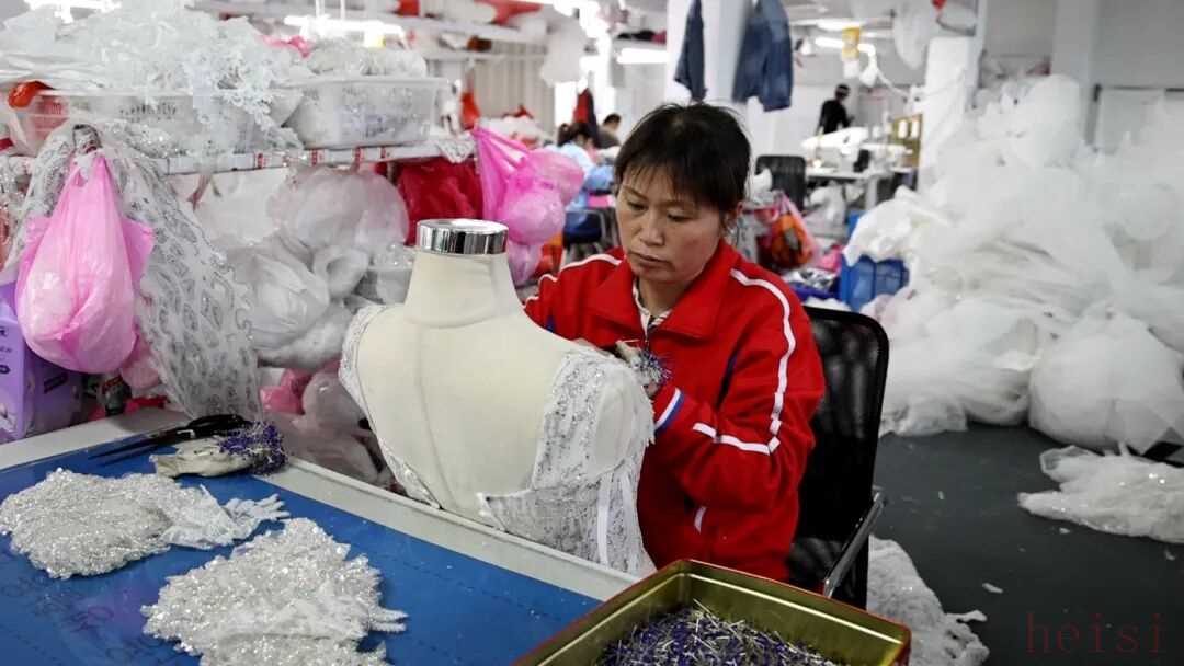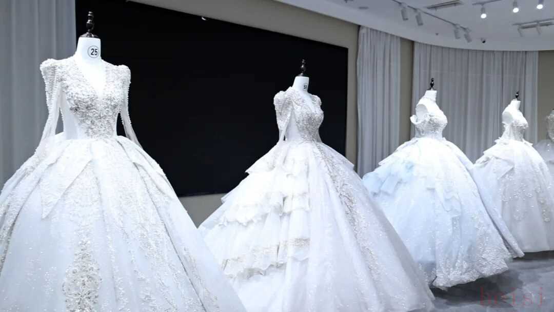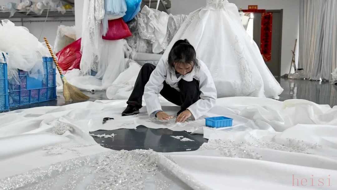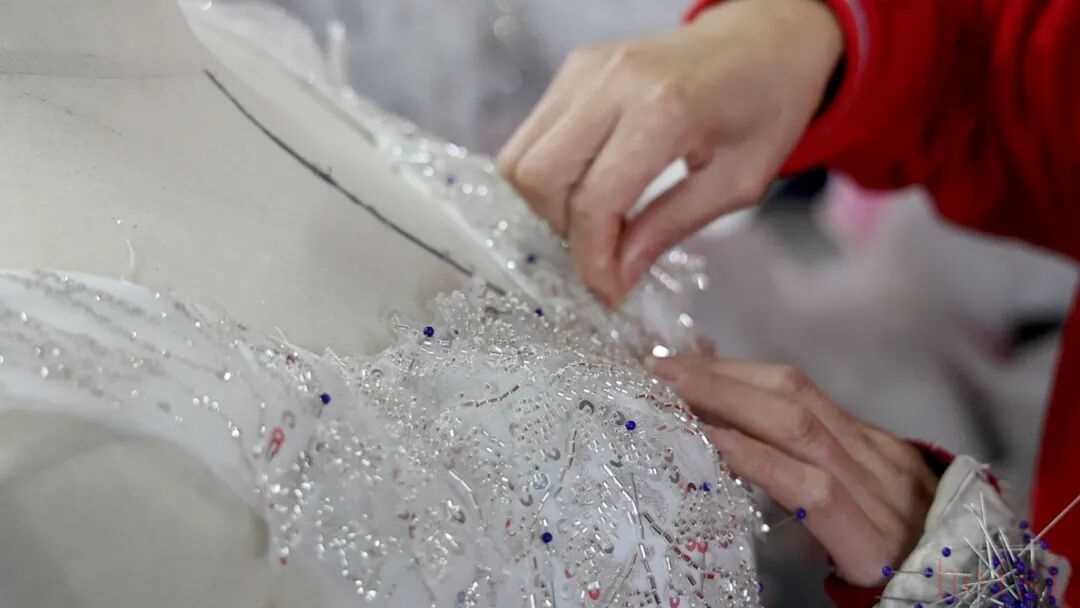 沿著展廳走向生產(chǎn)區(qū),工序銜接的緊湊感撲面而來:裁剪工位精準(zhǔn)落刀,釘珠工人指尖翻飛,縫鉆師傅專注走線?!岸〖茏龀苫榧啴a(chǎn)業(yè),靠的是三樣——深厚的產(chǎn)業(yè)根基、人才回流帶來的技術(shù)、‘小批量、快反應(yīng)’的柔性生產(chǎn)?!睆堖x高站在車間中央,指著流水線說,截至2025年,小鎮(zhèn)已吸引培育400余個婚紗品牌入駐,2024年全鎮(zhèn)年產(chǎn)值達(dá)24億元,產(chǎn)品不僅覆蓋國內(nèi)市場,更遠(yuǎn)銷海外30多個國家和地區(qū)。