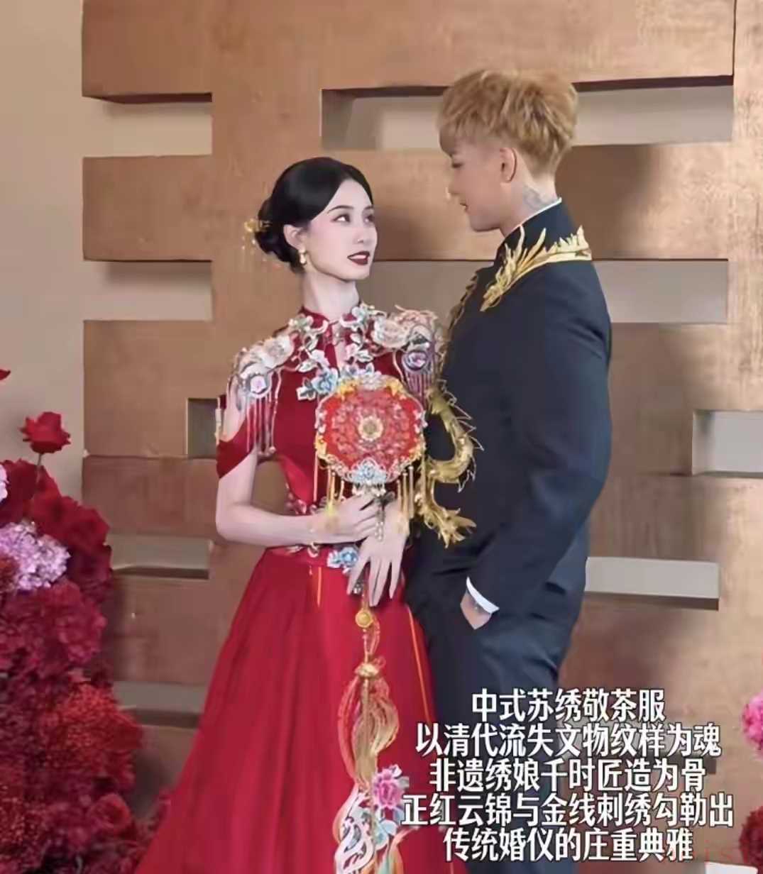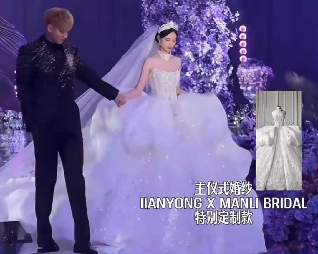 緊接著,徐藝洋換上了蘭玉設(shè)計的中式嫁衣,百鳥朝鳳圖案由非遺繡娘耗時兩個月精心繡制,盡顯東方之美。隨后,她穿上了一襲紫色漸變魚尾敬酒禮服,兩大品牌的聯(lián)名款,既時尚又優(yōu)雅。最后,她以西太后晨袍作為壓軸,全球停產(chǎn)的獨(dú)特設(shè)計簡約而不失個性,為這場婚禮畫上了一個完美的句號。