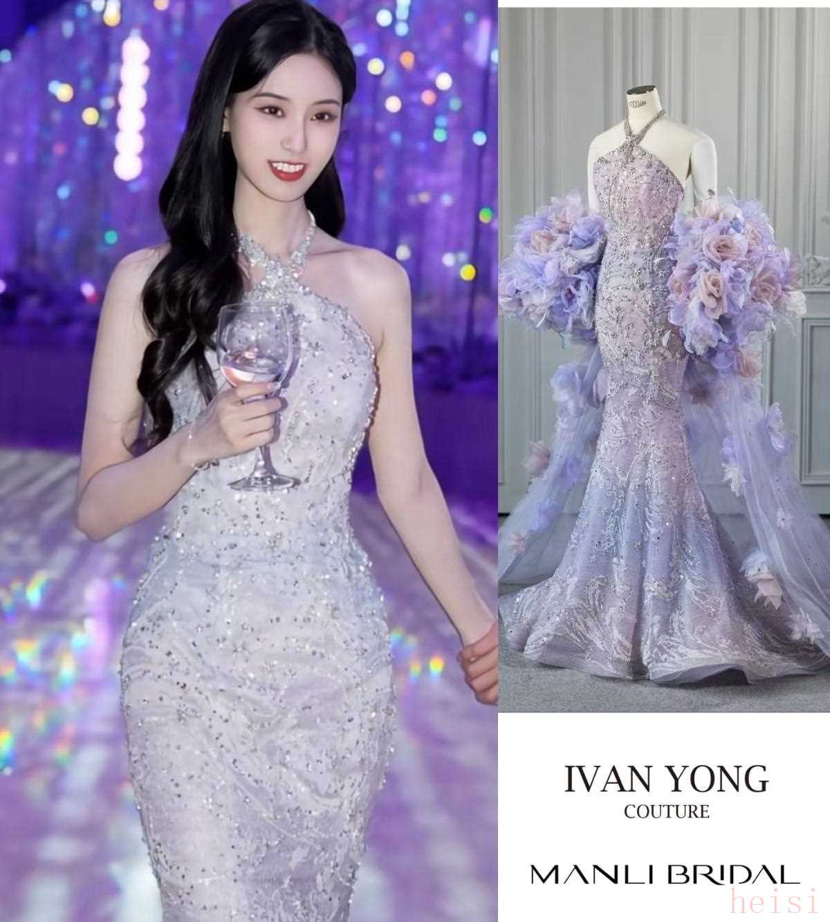 晚宴的敬酒環(huán)節(jié),徐藝洋換的是一件紫色漸變的魚尾禮服。裙身從深紫過渡到淺紫,裁剪很貼合身形,腰臀線條明顯,尾擺做成魚尾形,裙面點綴著星月形狀的亮片與刺繡。這套是兩家品牌聯(lián)名按她的身材改了多次版的,面料和裝飾都考慮到宴會燈光,走動時能顯出層次感。為了保證線條順滑,腰和臀部內(nèi)側(cè)加了內(nèi)襯和塑形片,不影響坐下、敬酒時的自然狀態(tài),拍照時也不會出現(xiàn)褶皺。