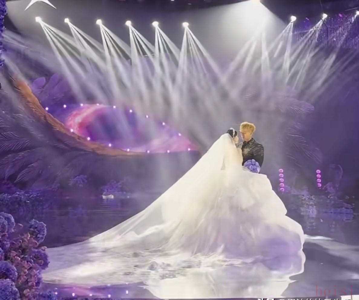正式婚禮上的主婚紗是量身定制的高訂禮服,剪裁把肩線和腰身的比例拿捏得很精準,裙面上有復(fù)雜的手工花紋,近看能發(fā)現(xiàn)星形的小亮片。這些亮片的位置是根據(jù)舞臺燈光做過多次測試才固定下來的,目的就是在儀式燈光下出現(xiàn)微微閃爍,配合“星空”主題,既莊重又有細節(jié)感。下擺有一定擴張,但不過分夸張,走臺時不會搶戲,重點是和丈夫在臺上的互動和畫面寬度。