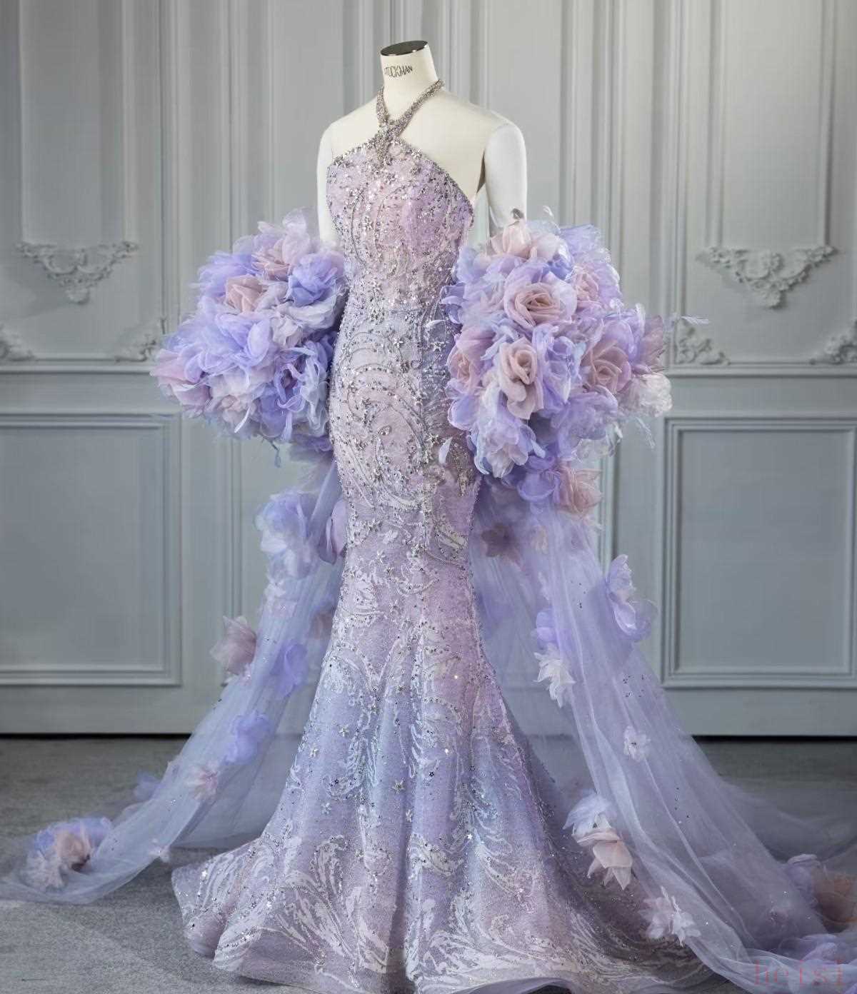 每套禮服背后都有很多功夫。中式嫁衣的繡工最耗時,幾位繡娘同時作業(yè),針腳密集;主婚紗的星形亮片不是隨意黏上的,位置和密度都經(jīng)過燈光拍照測試;紫色魚尾裙在腰臀處做了結(jié)構(gòu)處理,既顯身形也利于走動;Atelier的淡藍裙用了能反光的面料處理,專門為了外景拍照做的技術(shù)選擇。