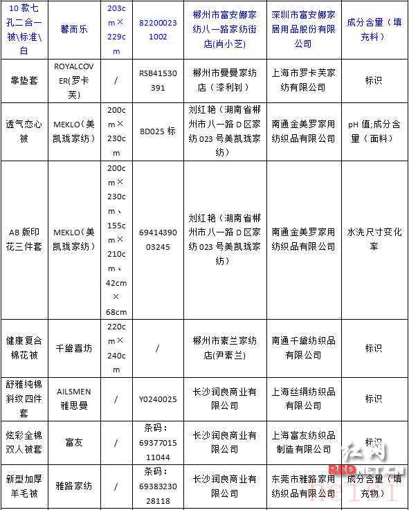 此次床上用品抽檢從長(zhǎng)沙、邵陽(yáng)、郴州三個(gè)地區(qū)的22家經(jīng)銷(xiāo)單位抽檢了60組樣品,不合格率達(dá)45%,主要存在成分含量、填充物質(zhì)量偏差率、標(biāo)識(shí)不達(dá)標(biāo)的問(wèn)題。其中,走高端路線(xiàn)的富安娜也未經(jīng)得起檢驗(yàn),旗下馨而樂(lè)10款七孔二合一被(生產(chǎn)批次:822000231002)因成分含量(填充料)未達(dá)標(biāo)登黑榜名單。