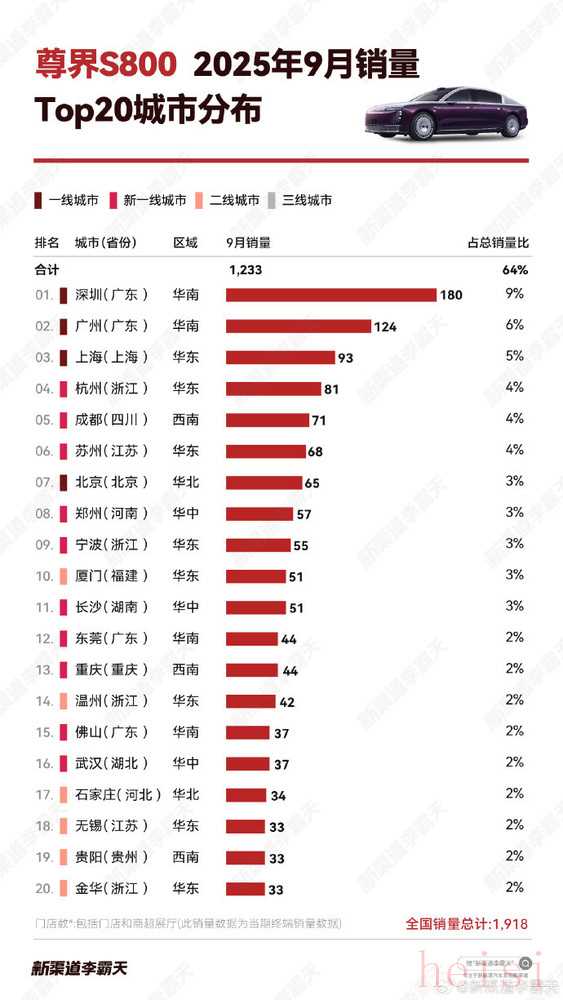 根據(jù)數(shù)據(jù),9月尊界S800銷(xiāo)售量為1918輛,TOP20城市共銷(xiāo)售1233輛,占總銷(xiāo)量的64%。其中,華東地區(qū)共有8座城市上榜,主要集中在江浙地區(qū),約占總銷(xiāo)量的25%。華南地區(qū)共有4座城市上榜,約占總銷(xiāo)量的19%。華中地區(qū)有3座城市上榜,約占總銷(xiāo)量的8%。西南地區(qū)同樣有3座城市上榜,約占總銷(xiāo)量的8%。值得一提的是,華北地區(qū)僅有北京和石家莊兩座城市入選,銷(xiāo)量?jī)H占總銷(xiāo)量約5%。