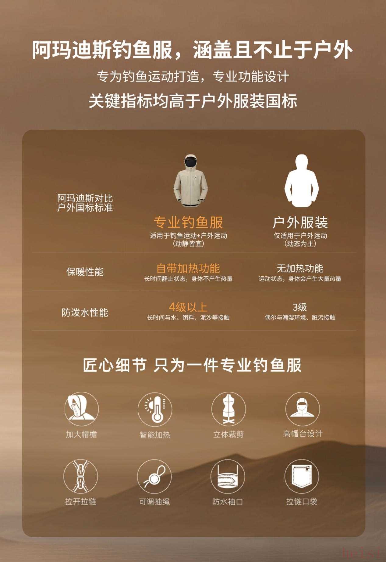"副標(biāo)題/補充文案:" 阿瑪?shù)纤箤I(yè)釣魚服智能加熱系列,搭載前沿科技,將溫暖精準(zhǔn)掌控。專為嚴(yán)苛環(huán)境設(shè)計,無懼風(fēng)雪挑戰(zhàn),讓每一次垂釣都舒適無憂。現(xiàn)在溫暖上市,開啟您的智能保暖新體驗!