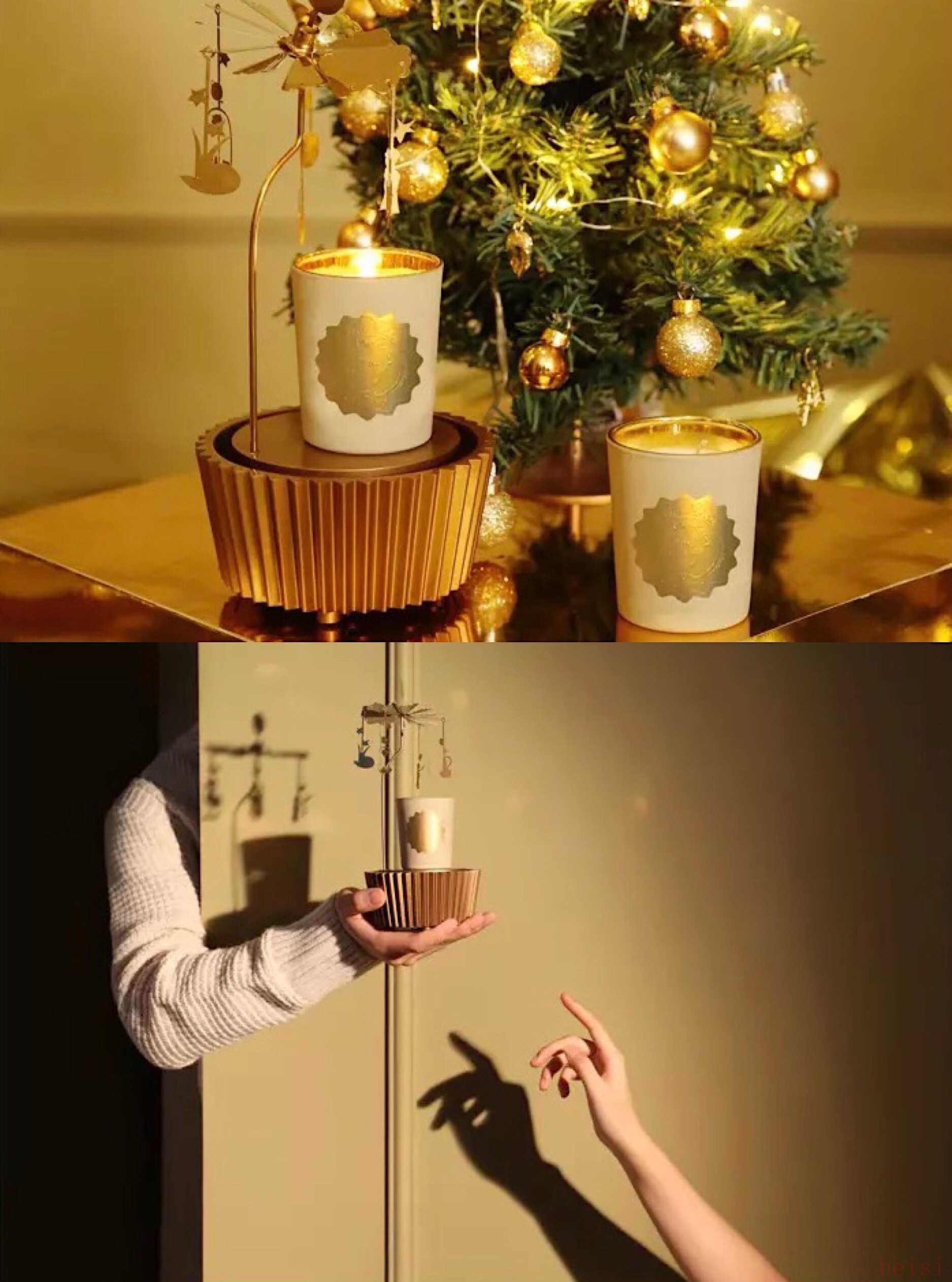 野獸派出品的“小王子音樂旋轉(zhuǎn)香氛蠟燭禮盒”中包含音樂旋轉(zhuǎn)臺(tái)、走馬燈吊飾,以及名為“鳶尾”與“星辰”的兩支香薰蠟燭。蠟燭瓶身的金色標(biāo)志,是小王子75周年的特別標(biāo)記。旋轉(zhuǎn)燭臺(tái)底部的金屬鑰匙,可以聽到一首經(jīng)典的法國音樂《La Vie en rose玫瑰人生》。在音樂聲中點(diǎn)燃蠟燭,燭火的熱氣徐徐上升,走馬燈開始旋轉(zhuǎn),光影重重,音樂不停,空氣里開始彌漫“醉人”的味道。