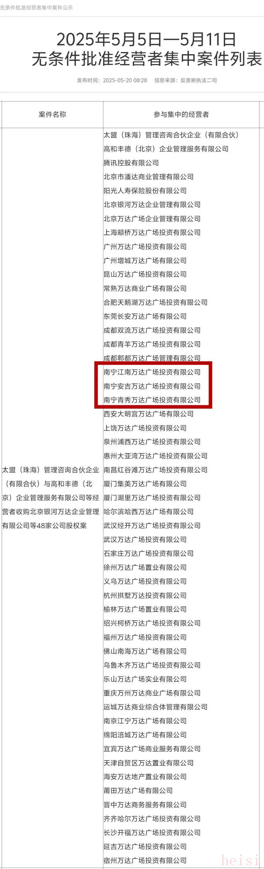 關(guān)注萬達(dá)新聞的家人們都知道,首富賣萬達(dá)廣場也不是什么新鮮事了,但這次不太一樣,其中包括南寧三座萬達(dá)廣場。曾經(jīng)重倉南寧的萬達(dá),這是要和南寧說再見了?01南寧三家萬達(dá)廣場將易主前兩天,國家市場監(jiān)管總局披露了一則收購信息——大連萬達(dá)商管出售旗下48家公司的股權(quán),這48家公司,對應(yīng)48個萬達(dá)廣場。買家大家也不陌生,包括太盟、高和、騰訊、京東與陽光人壽,幾個是接盤萬達(dá)廣場的熟面孔。其中,騰訊與京東參與了2018年的萬達(dá)商業(yè)340億元戰(zhàn)略投資、陽光人壽累計收購至少6座萬達(dá)廣場。這是王健林第三次將萬達(dá)廣場進(jìn)行大甩賣,據(jù)媒體報道,此次交易金額將達(dá)到500億元。以前首富賣資產(chǎn)我們都是看個熱鬧,但,這次萬達(dá)出售的48座萬達(dá)廣場包括南寧青秀萬達(dá)廣場、南寧安吉萬達(dá)廣場及江南萬達(dá)廣場。