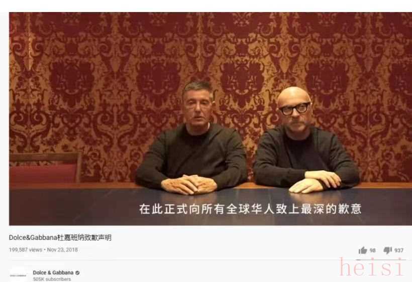 2018年,辱華事件輿論一再發(fā)酵后,杜嘉班納的創(chuàng)始人和負(fù)責(zé)人才遲遲發(fā)布一段道歉視頻,但對這個“不走心”的道歉網(wǎng)友并不買賬。圖/某社交媒體平臺上杜嘉班納賬號截圖
