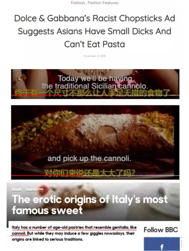 但“杜嘉班納”在2018年11月時引發(fā)的那起惡劣事件,并不只是找一個中國女模特用筷子尷尬地吃意大利菜,暗搓搓地通過“刻板偏見”取笑中國人乃至亞裔那么簡單。有新加坡的時尚媒體就懷疑,當(dāng)時的那組廣告中還暗藏著侮辱亞洲男性生殖器官短小的意思,因為影片中其中一道名為“意大利甜卷”(Cannoli)菜的形狀與男性生殖器相似,而且包括英國BBC在內(nèi)的西方媒體也曾在其他報道中提及意大利的這種“甜卷”確實有男性生殖器的隱意。
