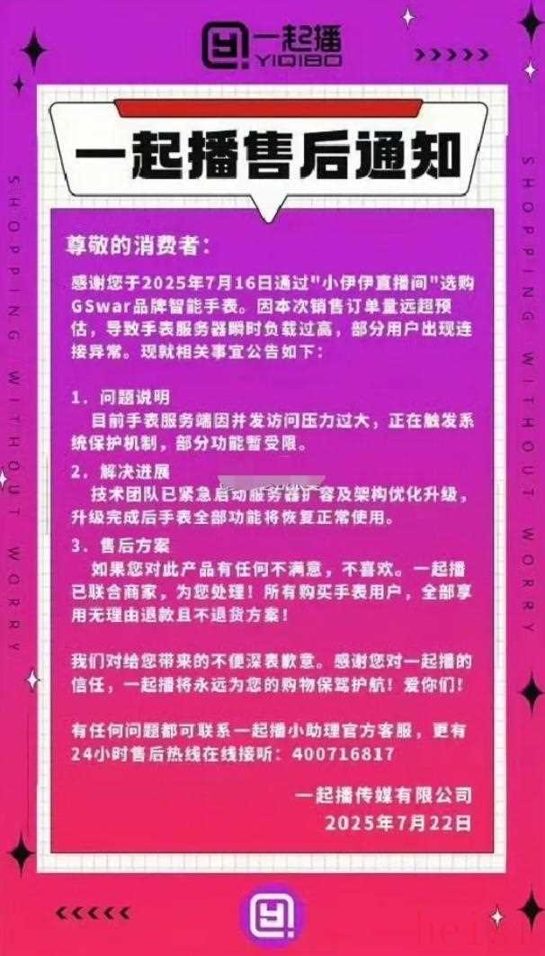 不過,在小雷開始撰寫這篇稿子時(shí),其賬號已經(jīng)解除封禁狀態(tài),但是也沒有發(fā)布針對智能手表事件的說明,這件事似乎就這么過去了。另一邊,與“小伊伊”合作的一起播傳媒有限公司倒是出具了一份售后通知,解釋了智能手表功能“貨不對板”的原因和后續(xù)的處理。