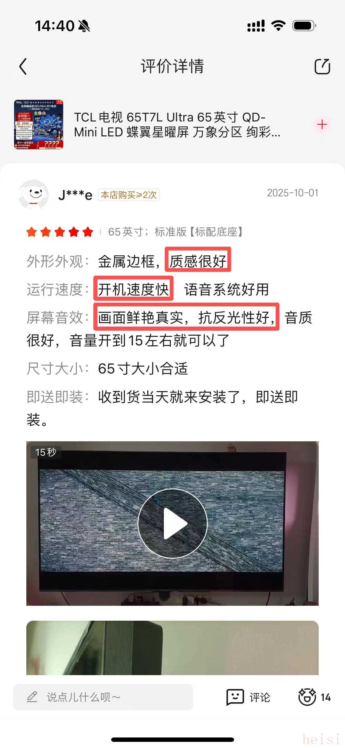 產(chǎn)品實(shí)力如何,用戶口碑最有話語權(quán)。在某電商平臺,TCL T7L Ultra的好評率幾乎高達(dá)100%,這正是它上線即秒空、屢屢斷貨的最佳注腳。 就像一位65吋機(jī)型用戶評價(jià)道:“畫面鮮艷真實(shí),抗反光性好”。在真實(shí)用戶眼中,它已不僅是電視,更是一款專為沉浸觀賽而生的神器。