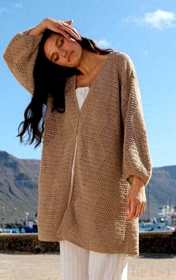 "鉤針網(wǎng)格:" 鉤針網(wǎng)格紋理賦予了這件外套獨(dú)特的質(zhì)感,既顯精致又不失休閑,讓你在細(xì)節(jié)處展現(xiàn)時(shí)尚感。