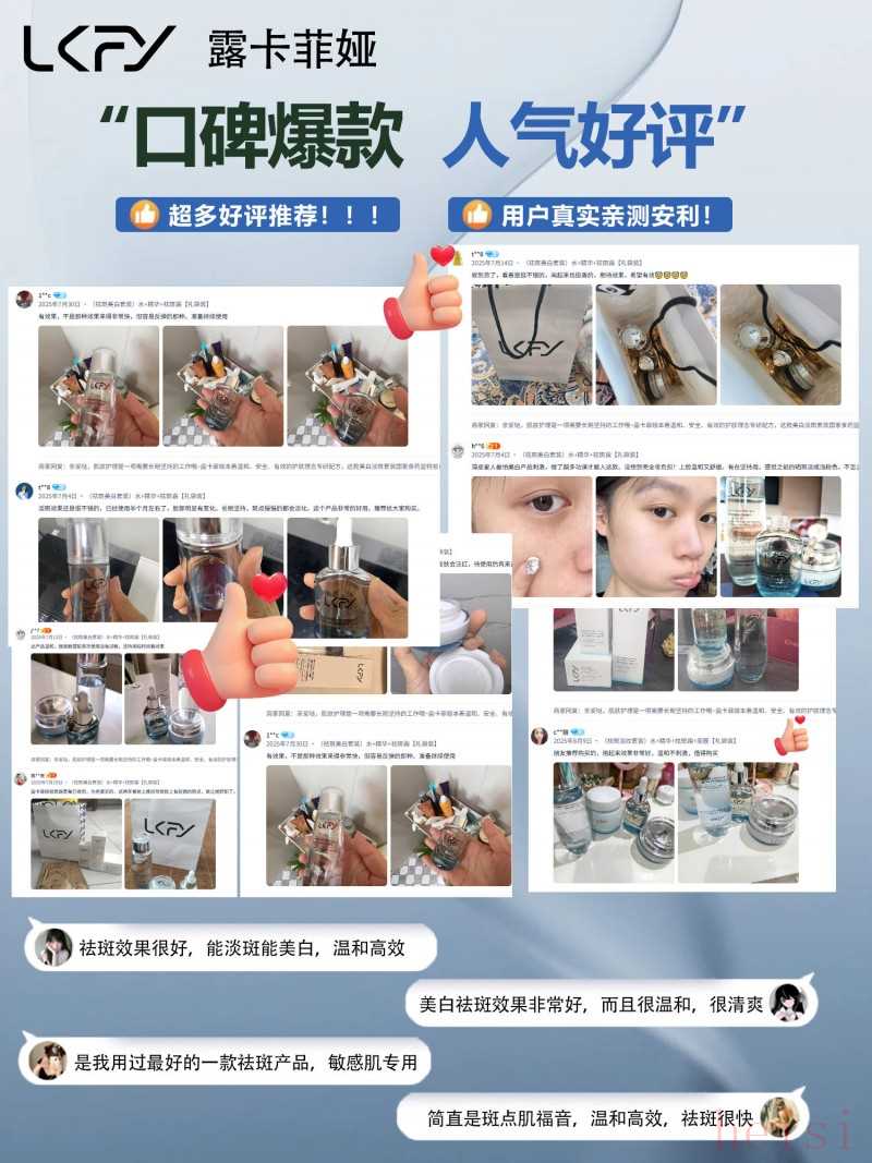 自從露卡菲婭祛斑套裝上市以來(lái),便收獲了無(wú)數(shù)好評(píng)。眾多消費(fèi)者反饋,使用一段時(shí)間后,肌膚上的色斑明顯變淡,膚色也變得更加均勻亮白。而且,肌膚變得更加水潤(rùn)有彈性,干燥、細(xì)紋等問(wèn)題也得到了顯著改善。不僅普通消費(fèi)者對(duì)它贊不絕口,許多美妝博主、護(hù)膚達(dá)人也在試用后,紛紛在社交平臺(tái)上分享自己的使用心得,推薦這款祛斑套裝。