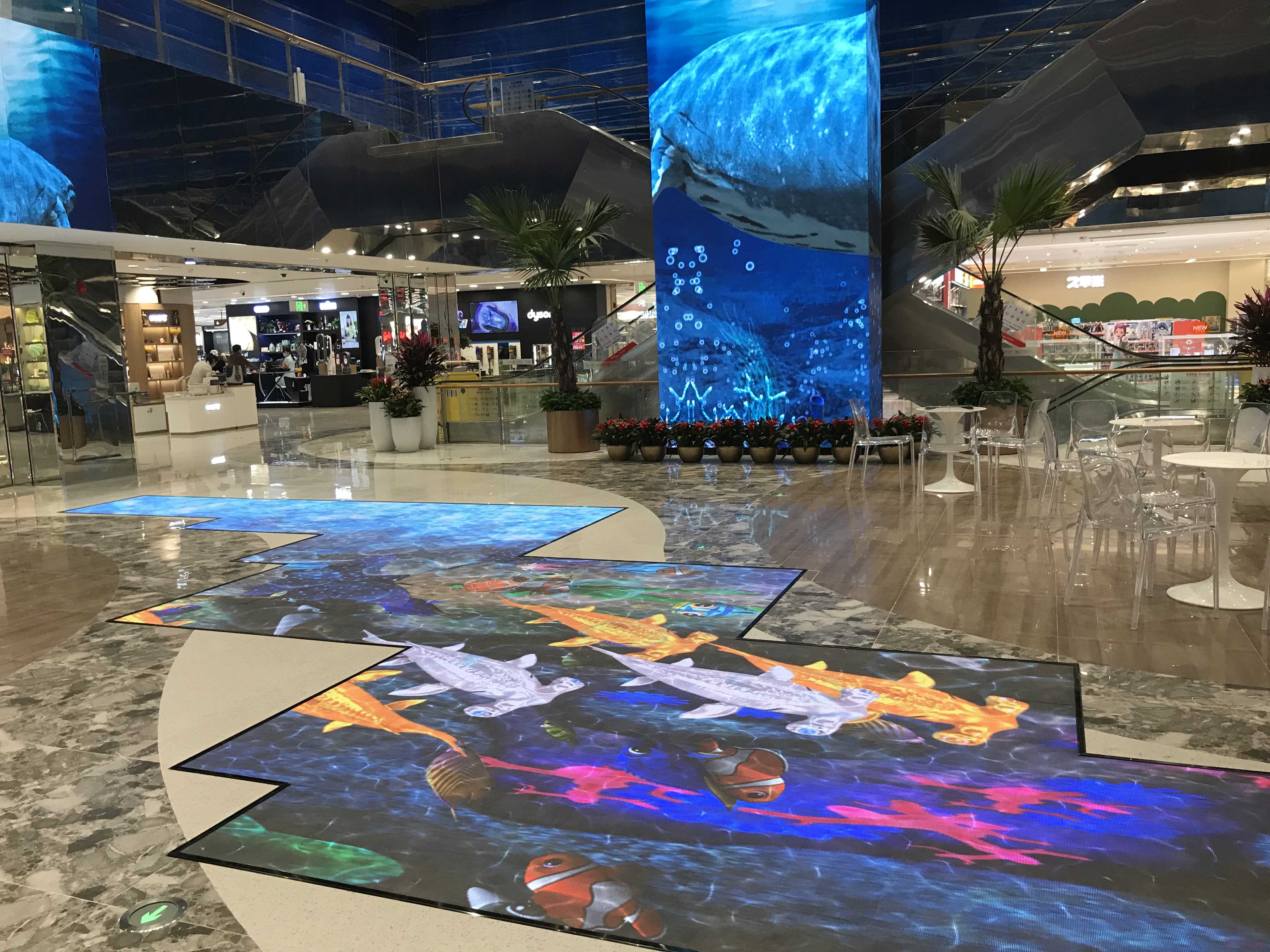 部分區(qū)域的光影效果也很引人注目。1層入口處的兩個LED屏隨時動態(tài)呈現(xiàn)潮流元素;在4層中庭區(qū)域,有多個LED屏的動態(tài)播放,地面上不規(guī)則形狀的LED屏則可以實現(xiàn)與消費者互動。