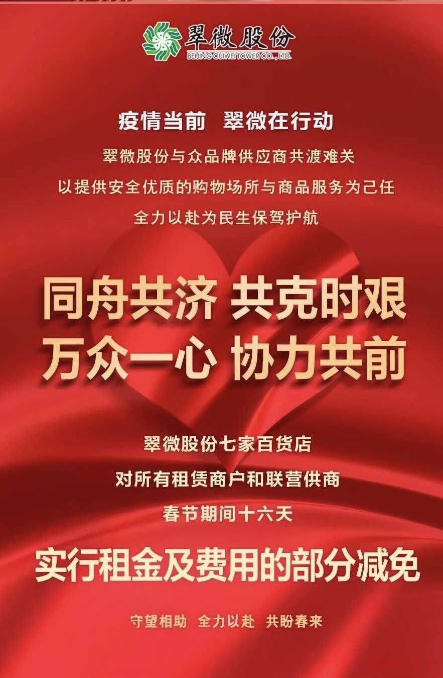新京報(bào)訊(記者 徐晶晶)針對當(dāng)前新冠肺炎疫情現(xiàn)狀,2月7日,翠微百貨翠微店通過官方微信公眾號正式對外公布,翠微股份將協(xié)助全體商戶降低經(jīng)營壓力,共克時(shí)艱。為此,翠微股份旗下7家百貨店對所有租賃商戶和聯(lián)營供商,實(shí)行春節(jié)期間16天的租金及費(fèi)用的部分減免。