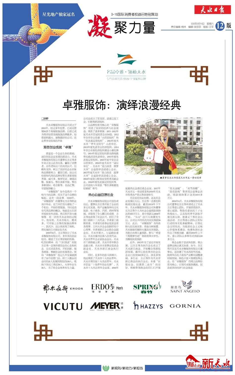 2014年4月,天水卓雅服飾有限公司董事長(zhǎng)方正偉申請(qǐng)成立了天水方正偉愛心團(tuán)隊(duì),開展捐資助學(xué)、愛心援助,幫助關(guān)愛農(nóng)民工子女和殘疾人,以及組織青年團(tuán)體開展交流互助、慈善義工等社會(huì)公益活動(dòng)。方正偉愛心團(tuán)隊(duì)以實(shí)際行動(dòng)倡導(dǎo)無(wú)私奉獻(xiàn)精神,引領(lǐng)社會(huì)文明風(fēng)尚,為推進(jìn)社會(huì)主義核心價(jià)值體系建設(shè)、構(gòu)建和諧社會(huì)作出了積極貢獻(xiàn)。截至2019年上半年,愛心團(tuán)隊(duì)以多種形式捐款220多萬(wàn)元。