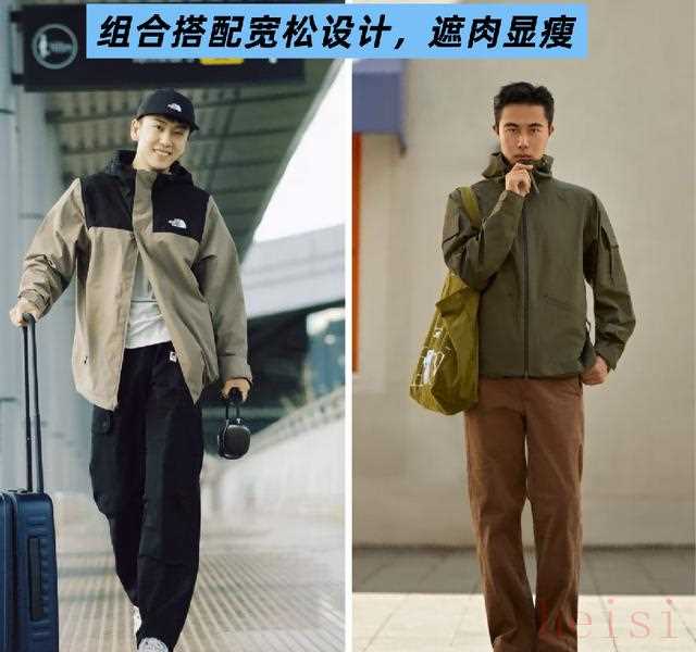 "沖鋒衣":通常版型相對(duì)簡(jiǎn)潔,肩線清晰,能夠勾勒出上半身的線條,特別是對(duì)于有一定肌肉或需要修飾身形的男士來說,效果很好。寬松的剪裁也能在一定程度上隱藏腰腹部的小問題。