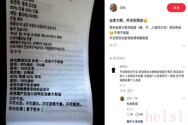 對(duì)比之下,加拿大鵝的透明吊牌像一張自嘲海報(bào):看,我就是鴨絨,你買(mǎi)不買(mǎi)?